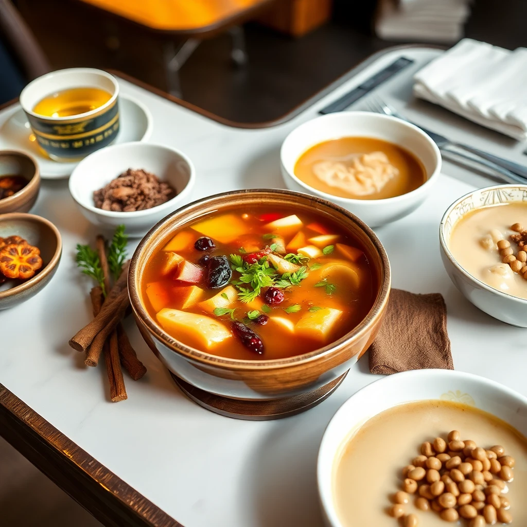 그다음으로, **보양탕(補養湯)**이 황제의 식탁에 올랐습니다. 이 보양탕은 맛있는 국물일 뿐 아니라, 황제의 건강을 지키는 비법이 담긴 약초들이 우러나 온 힘을 다해 면역력을 강화하고, 하루를 대비하는 힘을 북돋아주었습니다. 청나라의 왕족들은 ‘몸을 잘 다스리는 것’이 곧 위엄을 지키는 일이라 믿었기에, 보양탕은 황제의 건강을 위한 신성한 의식이었죠.