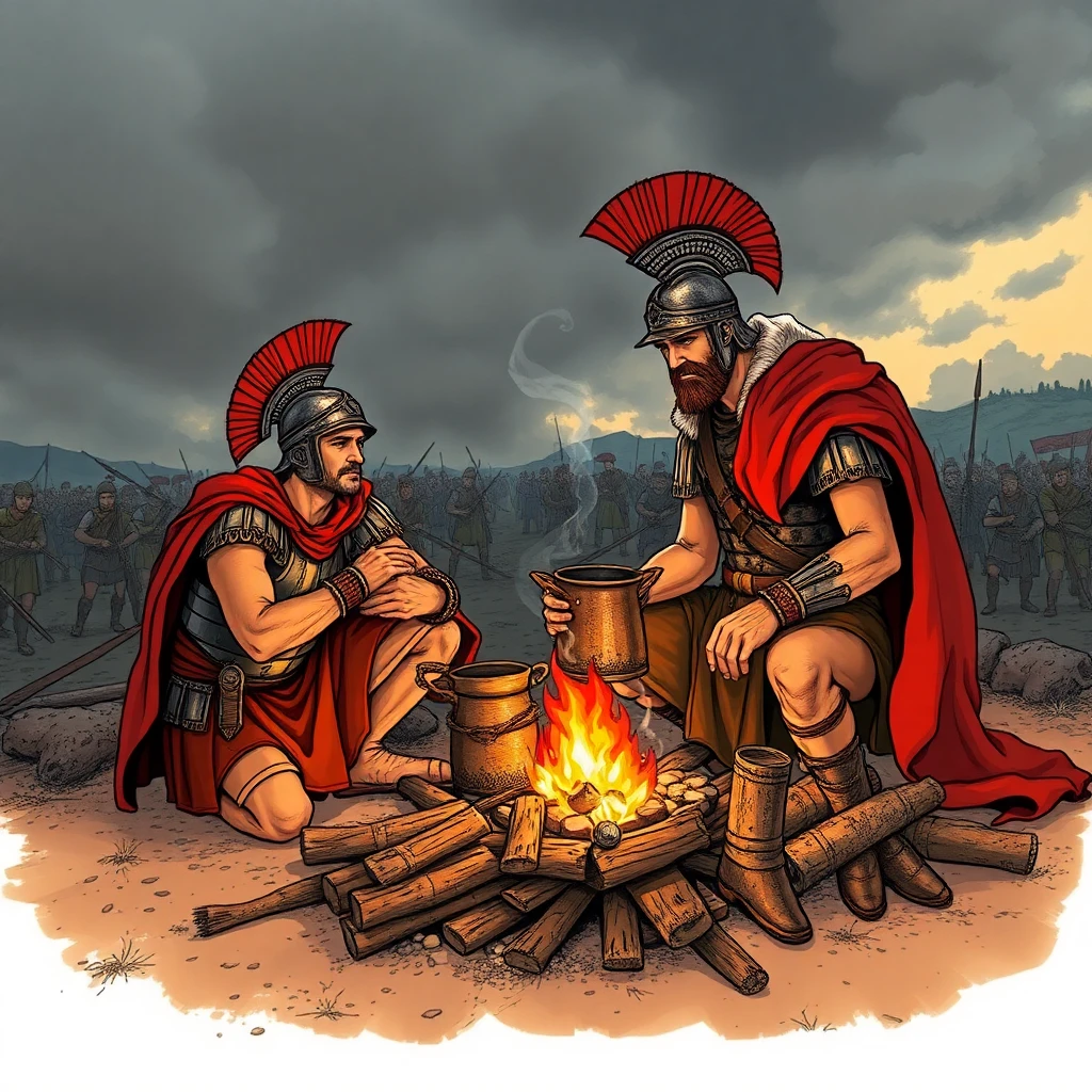고대 로마의 야영지는 단순히 전투를 위한 휴식처가 아니었습니다. 저녁이 되면 병사들은 하나둘 모닥불 주위로 모였습니다. 그들 손에는 밀가루, 렌틸콩, 말린 고기, 올리브유, 채소 등이 들려 있었죠. 불 위에 걸린 커다란 솥 안에는 죽이나 스튜가 보글보글 끓어오르기 시작합니다. 이것이 바로 로마 군단의 ‘이동식 부엌’이었습니다.