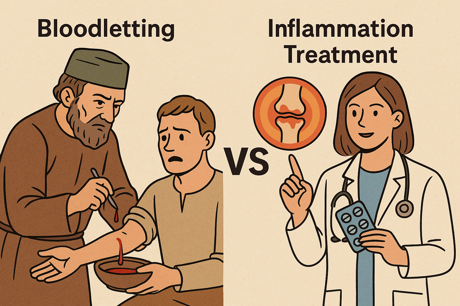 중세 유럽에서는 **염증을 치료하기 위해 '피 내리기'(혈액 채취)**라는 방법이 널리 사용되었습니다. 당시 의사들은 체내 불균형을 조절한다고 믿고 피를 뽑았죠. 물론 오늘날 이 방법은 효과가 입증되지 않았고, 위험한 방법으로 간주됩니다. 하지만 현대 의학에서는 염증과 관련된 다양한 질환을 다루기 위해 약물 치료와 생리학적 접근법을 사용하고 있습니다.